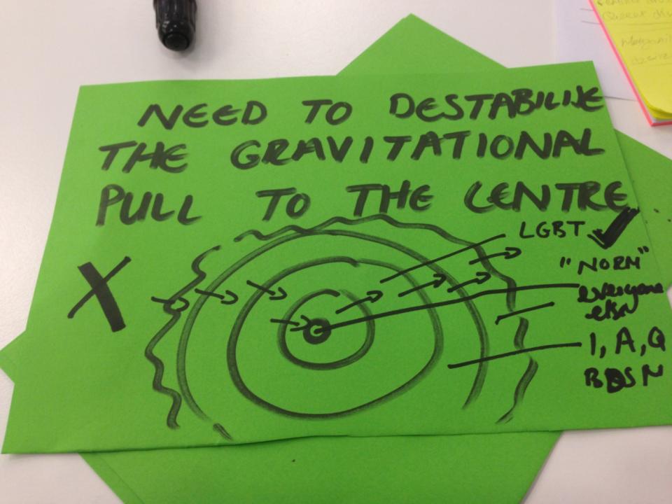 Un deseo marginado es cualquier deseo que esté fuera de la ‘norma’ o centro. El centro es donde se encuentran la heteronormatividad y los deseos tipo ‘vainilla’ (1), justo afuera del centro se encuentran los ‘aderezos’ del deseo por personas del mismo sexo, que se vuelve parte del centro de forma creciente. Los movimientos gay y de lesbianas han trabajado muy bien para asimilarse a la heteronorma, y ahora tienen su propia homonorma, a la vez que toman distancia de los deseos trans y queer. Fuera de esta homonorma es donde se encuentran las ‘coberturas’ y las ‘guarniciones’, en los márgenes.