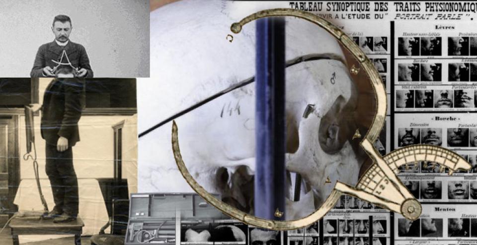 Image depicts historical and colonial modes of collecting data on those considered of inferior race and/or criminals. Source: archival photographs of instruments of anthropometry.