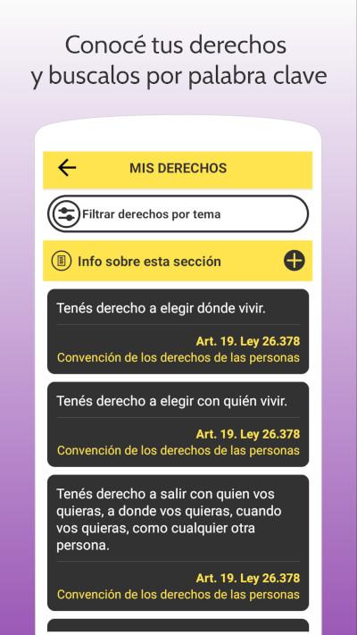 Contiene información útil sobre los derechos sexuales y reproductivos de las niñas, jóvenes y mujeres con y sin discapacidad. Incluye las normas que reconocen y protegen estos derechos. También cuenta con un buscador por palabras clave para encontrar rápidamente información cuando las usuarias lo necesiten.