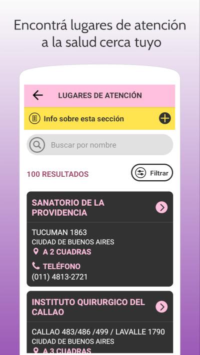 Permite buscar consejerías y lugares de atención médica cercanos a la ubicación de las usuarias. Con la geolocalización del dispositivo, la app muestra los 100 lugares de atención a la salud más cercanos. Para ello cuenta con una base de datos con más de 16.000 hospitales y centros de salud de todo el país, que fue facilitada por autoridades del Plan Nacional de Prevención del Embarazo No Intencional en la Adolescencia (ENIA).