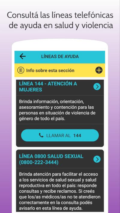 Son botones de llamado rápido. Se muestran las líneas telefónicas que brindan atención sobre derechos sexuales, violencia basada en género y coronavirus. La app provee información sobre el tipo de asistencia que ofrecen, horarios de atención y líneas de Whatsapp que son especialmente útiles para las personas que necesitan comunicarse a través de chat escrito o de videollamada, por ejemplo para las personas sordas que se expresan con lengua de señas.