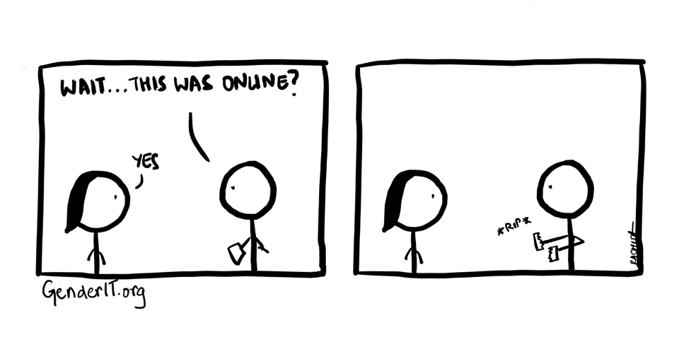 In this comic Sanitary Panels looks at how police and society react when women complain of threats, harassment and violence online.